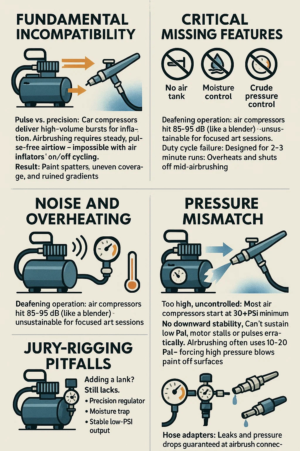 พัลส์เทียบกับความแม่นยำ: คอมเพรสเซอร์ของรถยนต์ส่งแรงดันลมในปริมาณมากตามอัตราเงินเฟ้อ การพู่กันลมต้องใช้การไหลเวียนของอากาศที่สม่ำเสมอและปราศจากชีพจร ซึ่งเป็นไปไม่ได้หากวงจรเปิด/ปิดเครื่องสูบลม