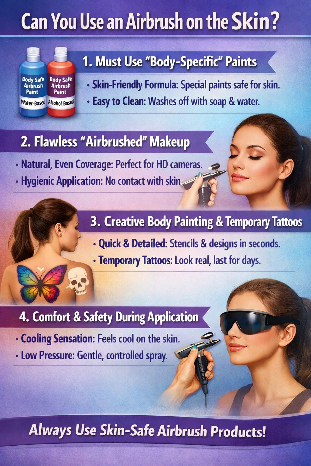 สูตรที่เหมาะกับผิว: สีแอร์บรัชที่ออกแบบมาสำหรับผิวโดยเฉพาะมักเป็นสีสูตรน้ำหรือแอลกอฮอล์ และส่วนผสมเป็นไปตามมาตรฐานความปลอดภัยของเครื่องสำอาง มีเนื้อบางเบามากและไม่อุดตันรูขุมขนหรือก่อให้เกิดอาการแพ้เหมือนสีทาทั่วไป
