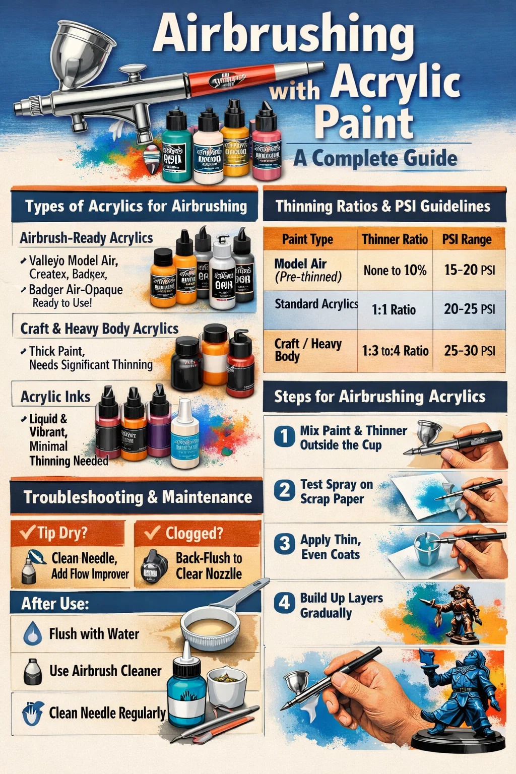 ใช่คุณสามารถ ใช้สีอะครีลิกอย่างแน่นอนใน แอร์บรัช และจริงๆ แล้วมันเป็นสื่อที่ใช้บ่อยที่สุดทั้งสำหรับมือสมัครเล่นและมืออาชีพ อย่างไรก็ตาม คุณไม่สามารถเทอะคริลิกสำหรับงานหัตถกรรมที่มีตัวถังหนักลงในถ้วยโดยตรงไม่ได้ เพื่อให้ได้หมอกที่ละเอียดและเรียบเนียน ต้องใช้สี เจือจางจนเป็นสีน้ำนมอย่างเหมาะสม และผ่านกระบวนการเพื่อให้แน่ใจว่าอนุภาคเม็ดสีมีความละเอียดพอที่จะผ่านหัวพ่นแอร์บรัชได้โดยไม่ก่อให้เกิดการอุดตันในทันที