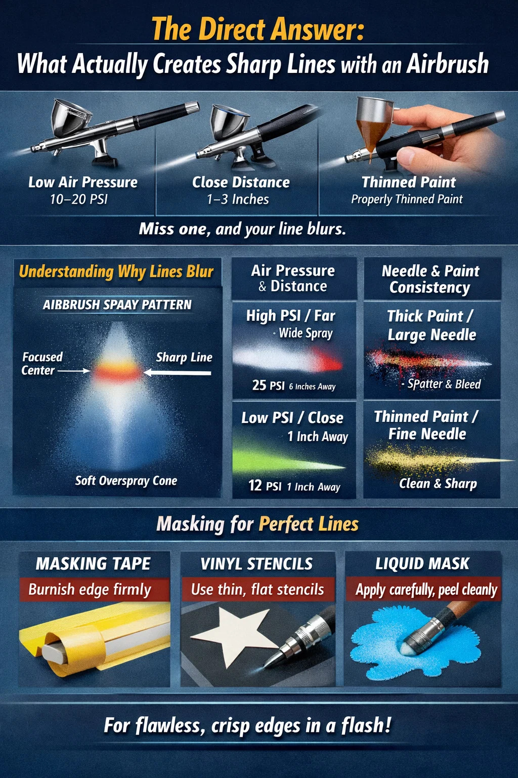 เส้นที่คมชัดด้วยแอร์บรัชจะมีตัวแปรหลักสี่ตัวที่ทำงานร่วมกัน: ความกดอากาศต่ำ (โดยทั่วไปคือ 10–20 PSI) , ระยะการทำงานที่ใกล้ชิด (1-3 นิ้วจากพื้นผิว), การทาสีให้บางลงอย่างเหมาะสม และการควบคุมไกปืนโดยเจตนา พลาดแม้แต่อย่างใดอย่างหนึ่ง เส้นของคุณก็จะอ่อนลง มีเลือดออก หรือกระเด็น ผู้เริ่มต้นส่วนใหญ่ต้องดิ้นรนเพราะพวกเขาทำงานไกลจากพื้นผิวมากเกินไปและใช้ความกดดันมากเกินไป ซึ่งเป็นนิสัยสองประการที่ทำลายความแม่นยำทันที